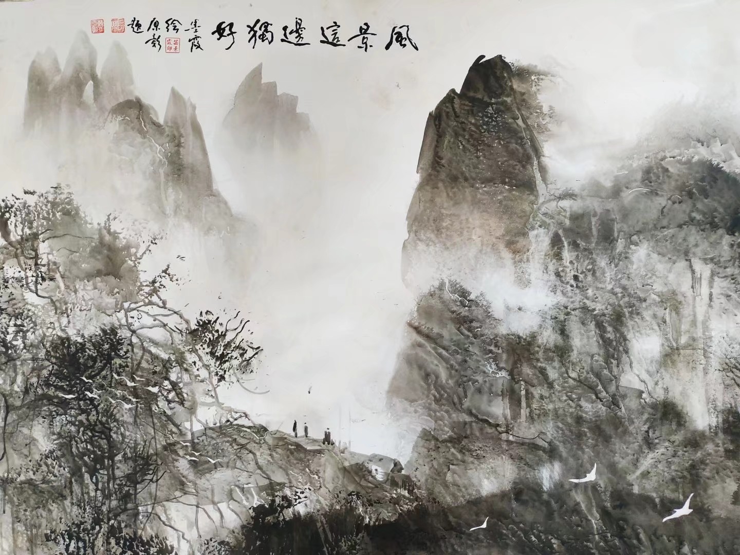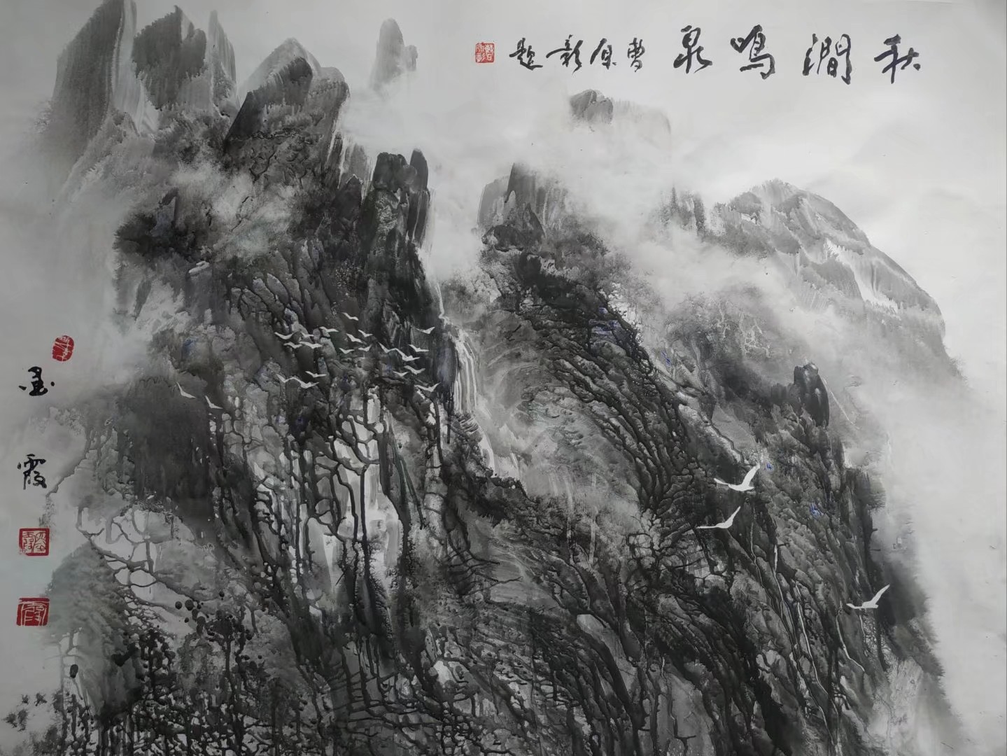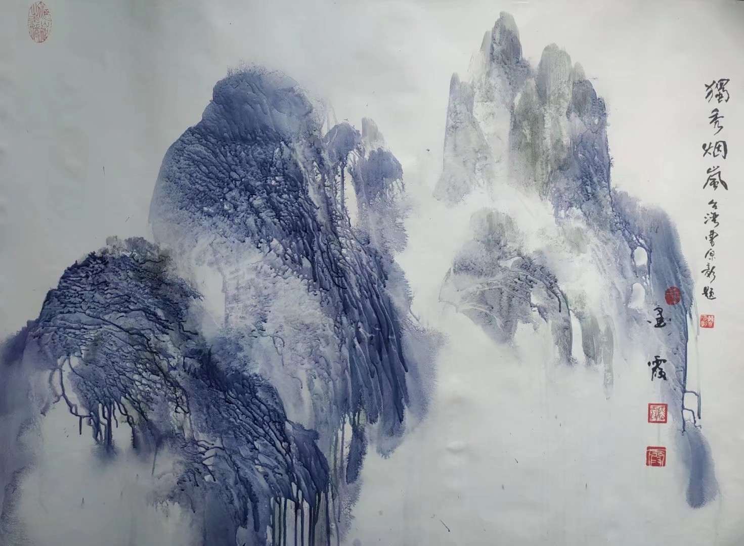 墨霞氏の作品は、大潑墨の創造的な様式を基盤とし、伝統山水画の精神と現代的表現を巧みに融合させている。その画面には、山水画の樹木や岩石の筆法が息づきながらも、柔らかで清新な情感と現代的な感性が共存している。