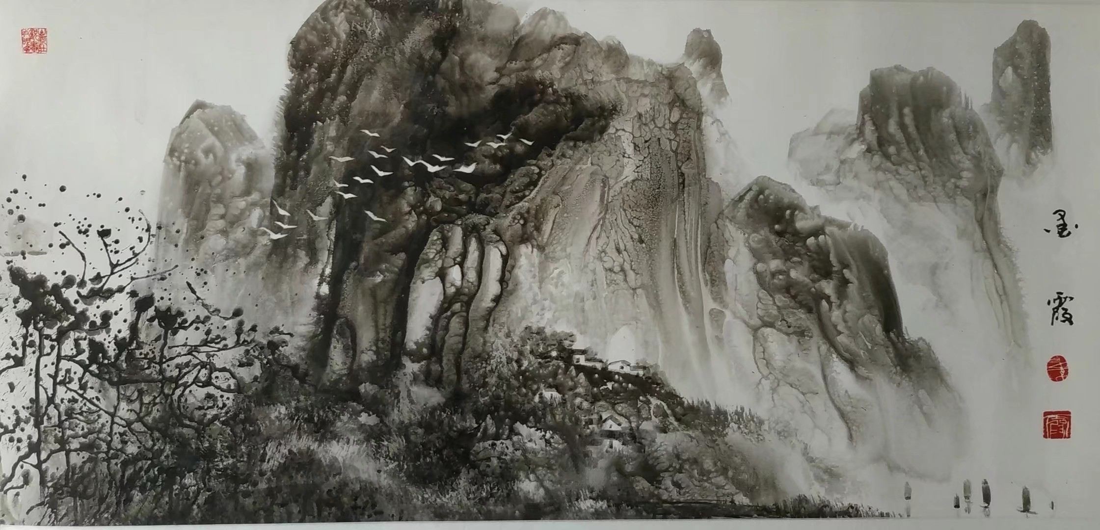 墨霞は潑墨と破墨の技法を用いて、山水の中に漂う呼吸と精神の調和を表現している。