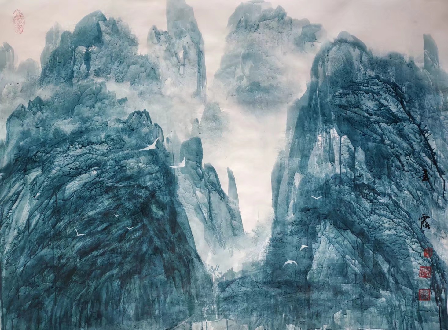 青嶂雲棲(せいしょううんし)は、青墨を基調とし、連なる山々と漂う雲霧を描いた作品である。